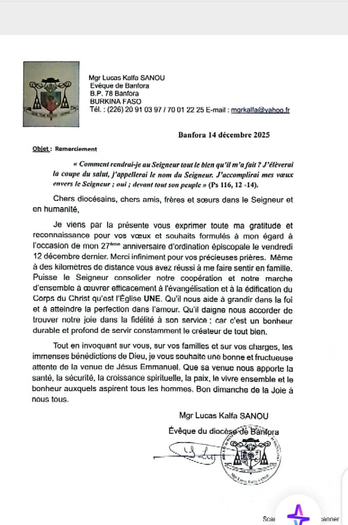 Lettre de remerciement de l’Ordinaire du Diocèse de Banfora à l’occasion de son anniversaire d’ordination épiscopale. Laisser un commentaire / Actualités, Blog, RELIGIEUX, SOCIETE, Uncategorized / Par diocesedebanfora.org